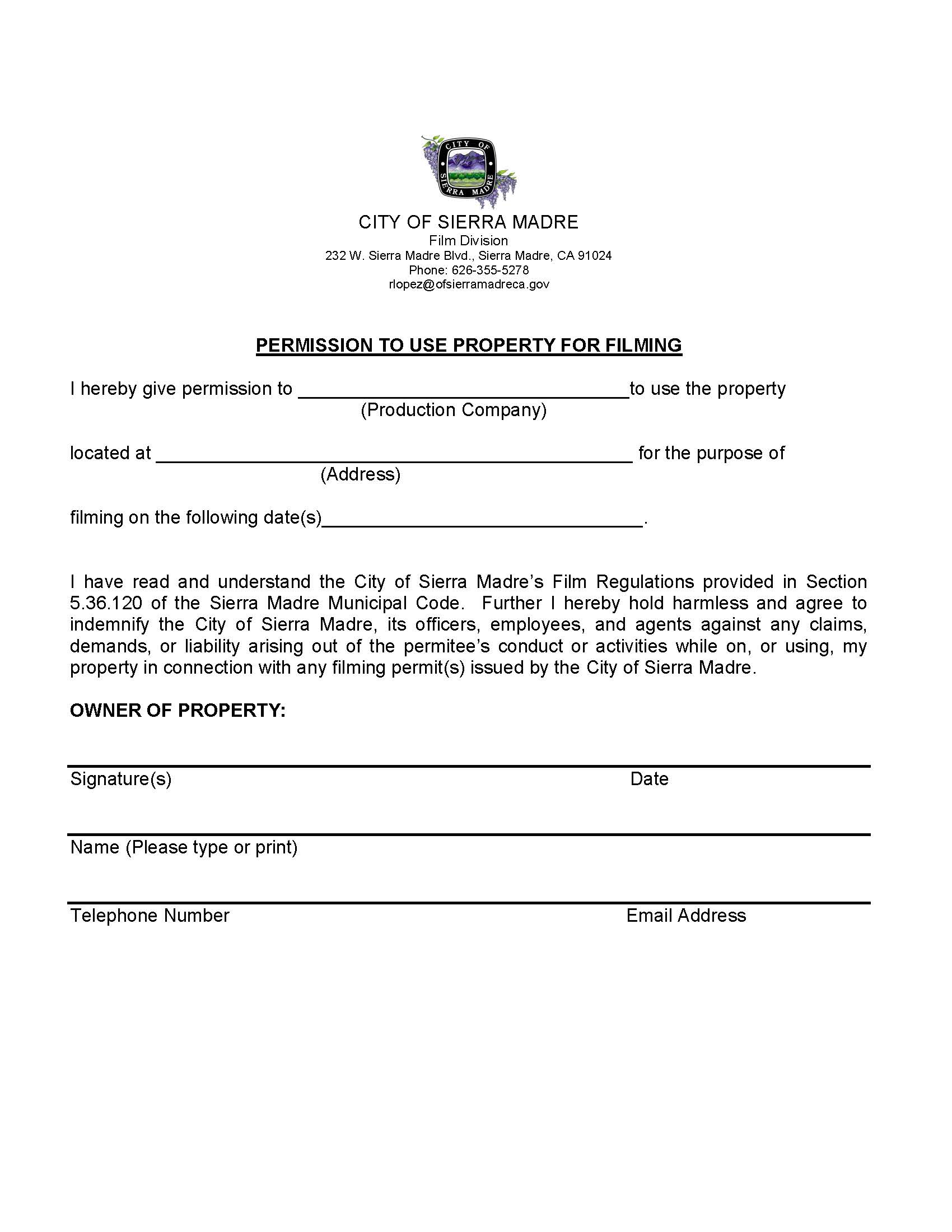 No. If a permit is granted the Film Monitor will ask for a Property Permission Form with the owner's information and stated approval which will be attached to permit. The Film Coordinator or City Designee will be on site for the duration of a motion picture shoot along with an Fire Safety Officer and Police if they are needed. Should any activity occur without a City permit or City representative contact the Sierra Madre Police Department at 626-355-1414.